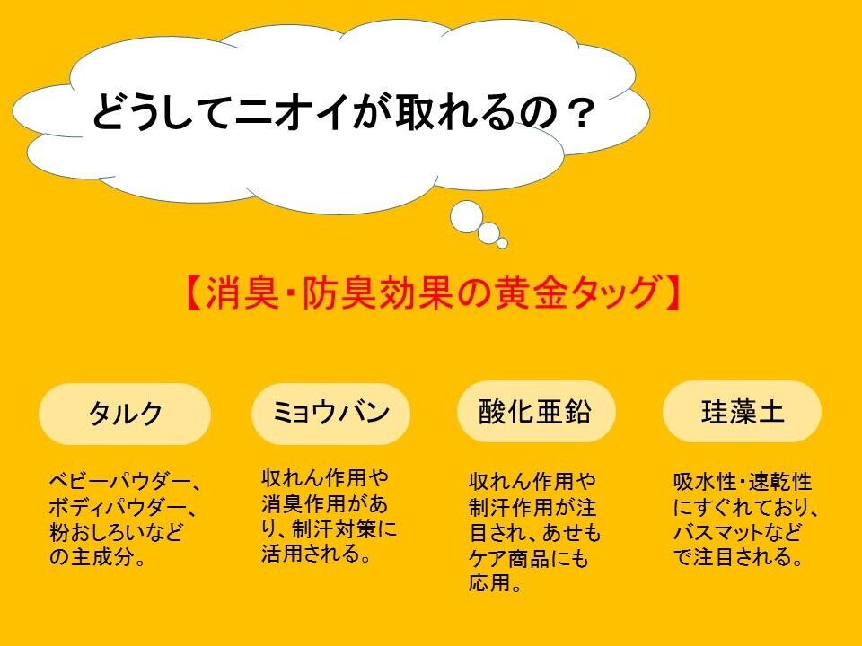 「ふっと粉」は、タルク・ニョウバン・酸化亜鉛・珪藻土が主成分。いずれの成分も汗を抑える効果があり、中でもミョウバンはそれ自体が弱酸性で、アンモニアなどのアルカリ性のニオイに対して、中和して消臭します。